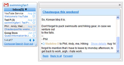 You'll see that it covers the rudiments such as reading, searching, and sending messages. You can star messages, use the unchanged keyboard shortcuts, and we consider about contact auto-complete. It doesn't occupy much space in your sidebar or desktop, and you can also resize it to show as few or as a lot of messages as you'd like.
