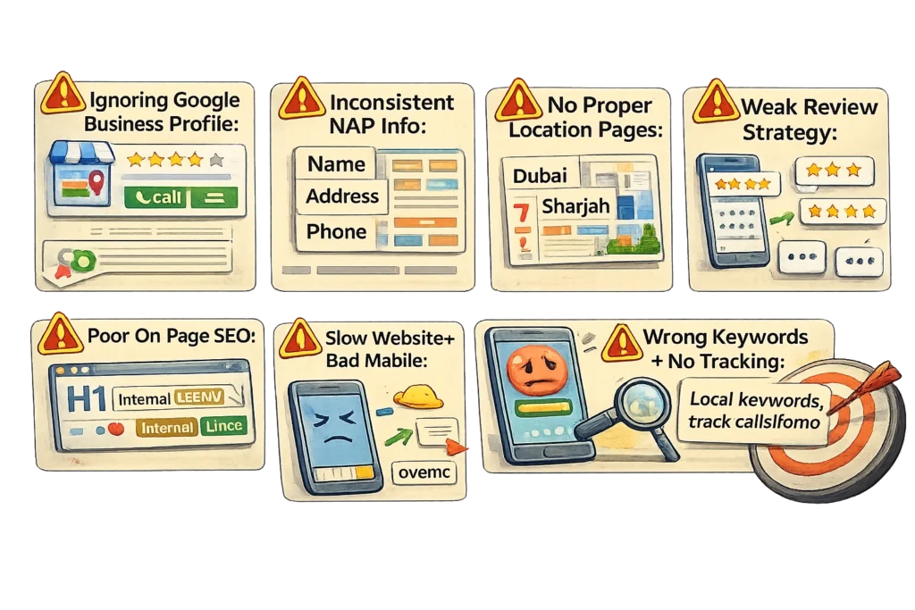The seventh mistake is targeting the wrong keywords and not tracking results. Many businesses chase broad terms like “best company” instead of high-intent searches like “service in [city]” or “near me,” and then they don’t measure calls, forms, or GBP actions. The fix is to target keywords with clear buying intent, set up tracking for calls/forms/WhatsApp clicks, and monitor GBP insights (calls, direction requests). When you track the right metrics, you can focus on what actually brings leads.