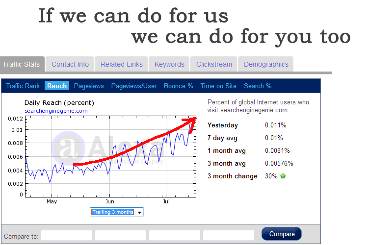 Search Engine Genie is one of the highest ranked sites in Alexa. We offer web site promotion and search engine optimization services. Including PPC, SMO and advanced link building. We have received hits (i.e. Traffic) of about 549559 per day. And the pages viewed per day is about 205046.Our traffic is being increased day by day. If we can do for us we can do for you, no traffic in your site we guarantee you a full fledged traffic in your site.